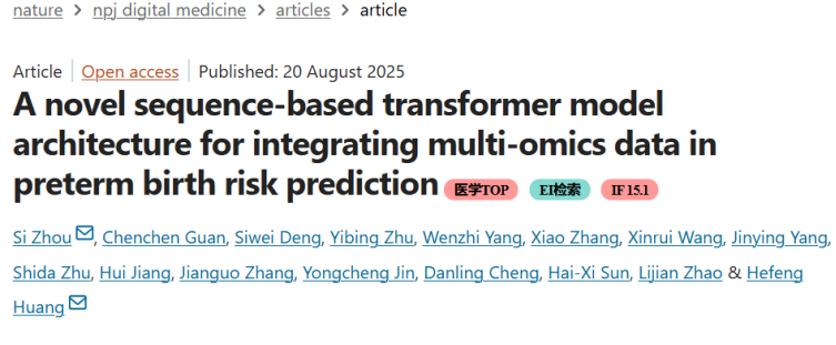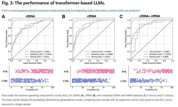 本文标题为“A novel sequence-based transformer model architecture for integrating multiomics data in preterm birth risk prediction”,由 Si Zhou、Chenchen Guan、Siwei Deng等多位研究者共同完成。该研究针对早产(Preterm Birth, PTB)导致的母婴死亡及长期发病问题,开发了一种基于Transformer 的新型大语言模型(LLM)架构,整合孕妇血浆中的无细胞DNA(cfDNA)和无细胞RNA(cfRNA)多组学数据以预测早产风险。研究纳入中国两个前瞻性队列(LG队列和FJ队列)共682名孕妇,通过模型训练与验证发现,整合 cfDNA与cfRNA的模型测试集AUC 达0.890,显著优于cfDNA单组学模型(AUC=0.822)和cfRNA单组学模型(AUC=0.851);同时结合RNA编辑分析进一步验证多组学整合的优势,并揭示了早产相关的炎症反应及RNA 调控网络,为精准产科及生物医学领域的AI驱动多组学应用提供了新方向