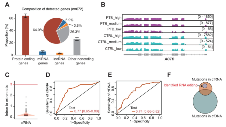 cfRNA 组成与质量控制(图A-C):672 例样本的cfRNA中,蛋白编码基因(64.0%)和miRNA(26.3%)占比最高;管家基因ACTB的测序覆盖主要集中在外显子区域,且内含子-外显子读数比<3,证明无基因组 DNA 污染,数据质量可靠;