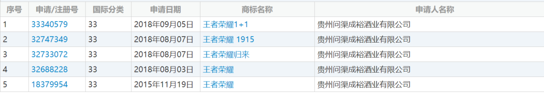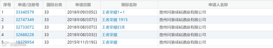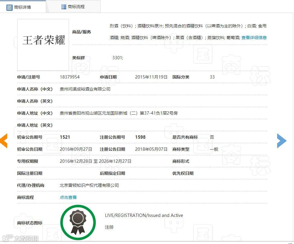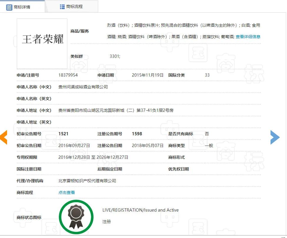 2015年11月19日,贵州问渠成裕酒业有限公司(下称问渠酒业)申请注册第18379954号“王者荣耀”商标(下称诉争商标),指定使用在第33类烈酒(饮料)、烧酒、酒精饮料(啤酒除外)、果酒(含酒精)等商品上,期间商标被提起异议,不过最终于2018年5月7日被核准注册。