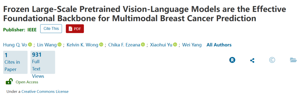 论文题目为《Frozen Large-Scale Pretrained Vision-Language Models are the Effective Foundational Backbone for Multimodal Breast Cancer Prediction》,由休斯顿大学、休斯顿卫理公会癌症中心、德州大学MD安德森癌症中心等多家顶尖科研机构联合完成,作者包括Hung Q. Vo、Lin Wang、Kelvin K. Wong、Chika F. Ezeana、Xiaohui Yu、Wei Yang、Jenny Chang、Hien V. Nguyen和Stephen T. C. Wong。研究创新性地提出了一种基于冻结的大规模视觉-语言预训练模型(VLM)的多模态乳腺癌预测方法,充分利用VLM强大的跨模态表征能力,将乳腺X线病灶图像与电子健康记录(EHR)中的结构化临床信息通过Tab2Text模块转化为自然语言描述,实现影像与文本的深度融合。与传统的图像-表格深度学习方法相比,该框架不再依赖于繁琐的特征对齐和手工特征工程,能够有效解决多中心EHR数据标准不一致的问题,大幅提升了模型的泛化能力和稳定性。实验结果显示,模型在CBIS-DDSM数据集上,验证集AUC从0.867提升至0.902,测试集从0.803提升至0.830;在EMBED数据集上,AUC由0.780提升至0.805;在小样本高不确定性的BI-RADS 3病例中,AUC更是达到0.96。该方法不仅在性能上取得显著突破,还显著降低了训练成本,具备极强的扩展性和实际临床应用价值,为推动多模态医学人工智能的发展提供了全新范式和技术路径。