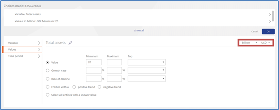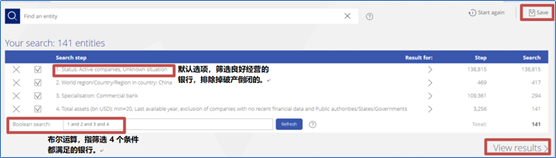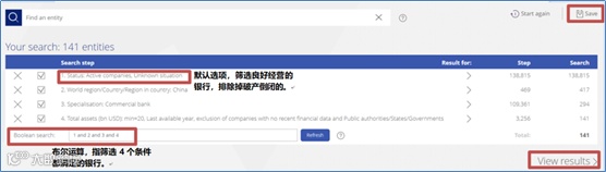 上文提到的检索条件实际上就是search功能下“Add a search step”的页面。我们以筛选中国总资产超过200亿的商业银行为例,来具体应用一下: