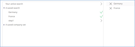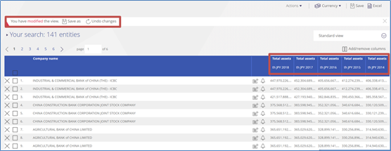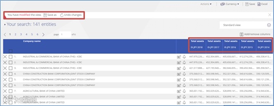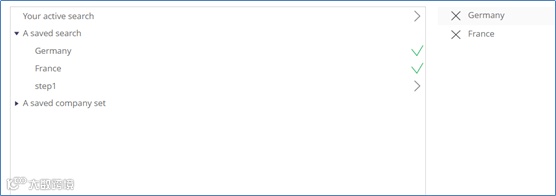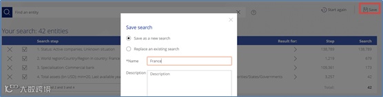 比如说,我们想要知道德国和法国总资产超过200亿的商业银行有哪些差异,可以先在“search”中保存这两组筛选条件,分别命名为Germany和France。