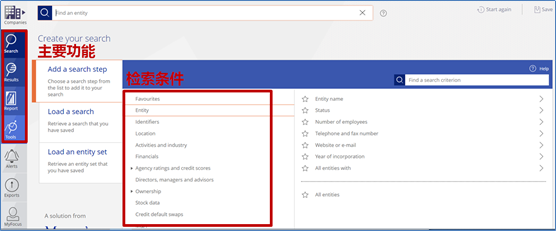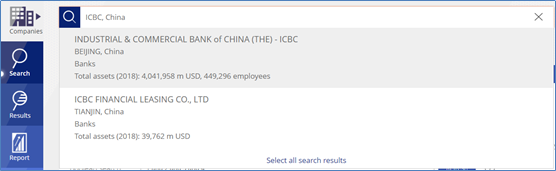 如已知公司名称,点击“companies”,在页面最上端的快速搜索栏中查询,输入公司名称、国家/地区名称或BvD银行索引号,即可匹配到目标对象: