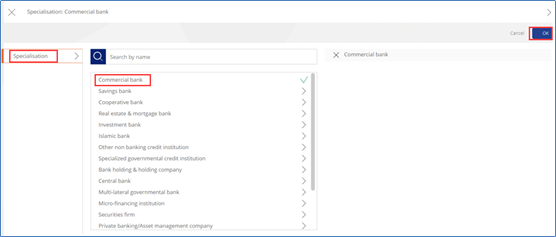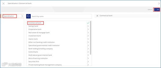 (2)在“Activities and industry”选项下的“Specification”,设定银行性质: