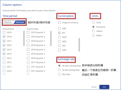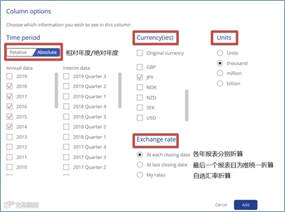 在弹出的options界面中选择年份、币种、汇率、单位: