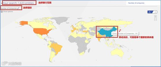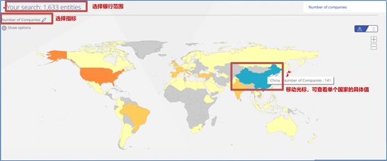 比如,将筛选条件设为全球总资产超过200亿的商业银行,就可以得到这些银行在不同国家的分布: