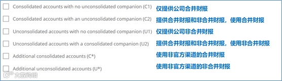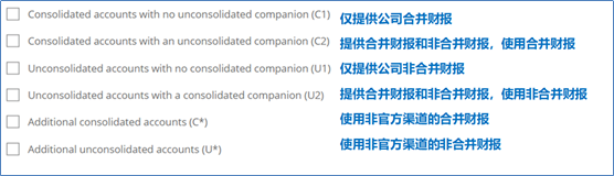 我们发现前三行均是中国工商银行的信息,但它们的consolidation code(合并报表代码)不同。该字段的含义如下:
