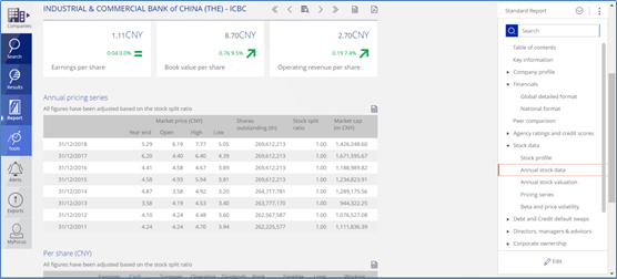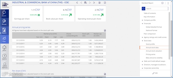 根据右侧的目录索引,可以进入其他章节。比如单击“Stock Data”“Annual Stock Data”,就可查看工行的年度股市数据。