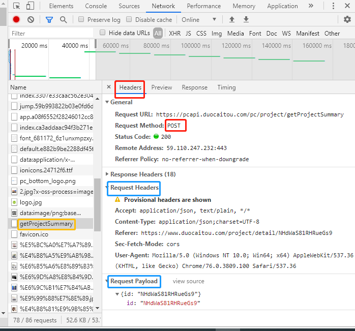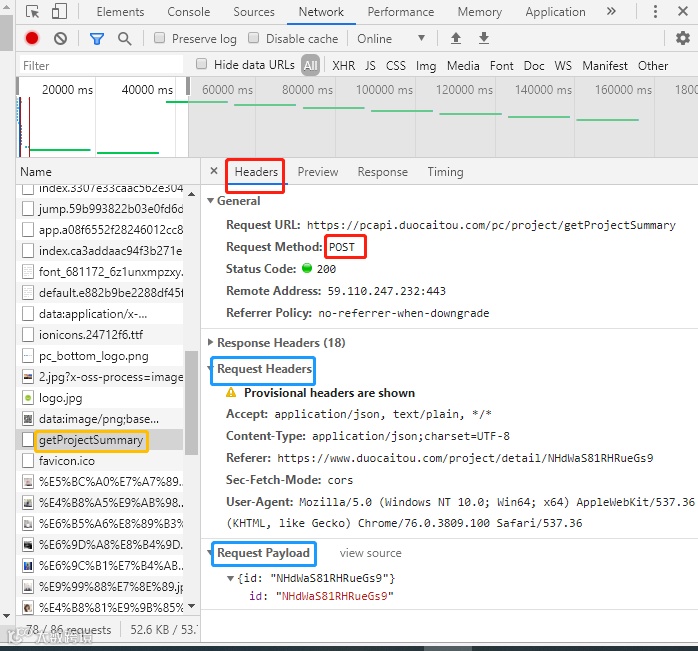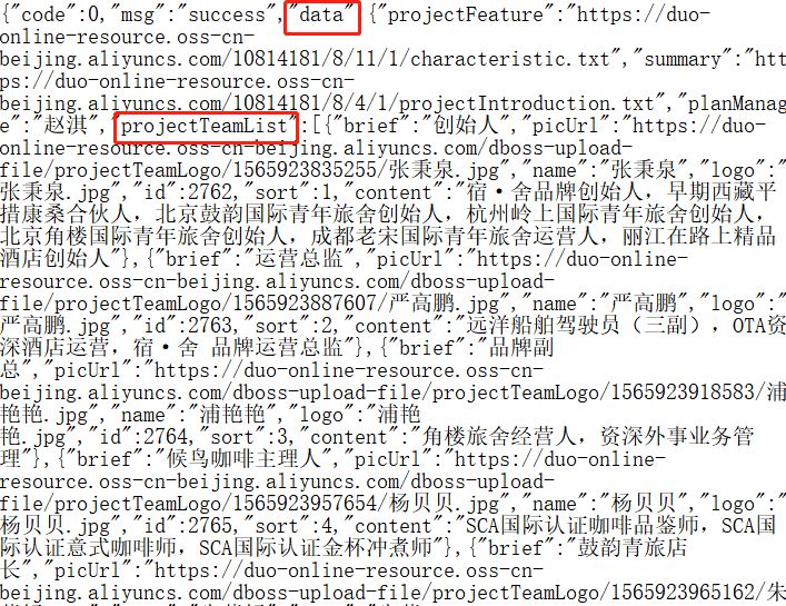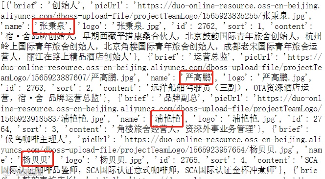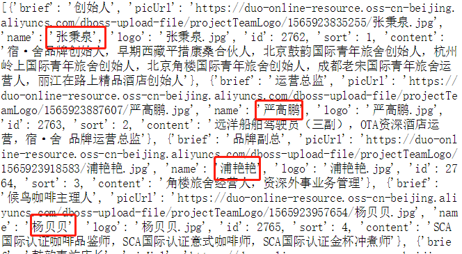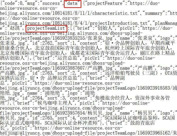 url="https://pcapi.duocaitou.com/pc/project/getProjectSummary"headers={"Accept": "application/json,text/plain, */*","Content-Type": "application/json;charset=UTF-8","Referer":"https://www.duocaitou.com/project/detail/NHdWaS81RHRueGs9","Sec-Fetch-Mode": "cors","User-Agent": "Mozilla/5.0 (Windows NT 10.0; Win64; x64)AppleWebKit/537.36 (KHTML, like Gecko) Chrome/76.0.3809.100 Safari/537.36"}data = {"id":"NHdWaS81RHRueGs9"} #此项目对应的idreq=json.loads(requests.post(url,headers=headers,data=json.dumps(data)).text)["data"]["projectTeamList"]print(req)