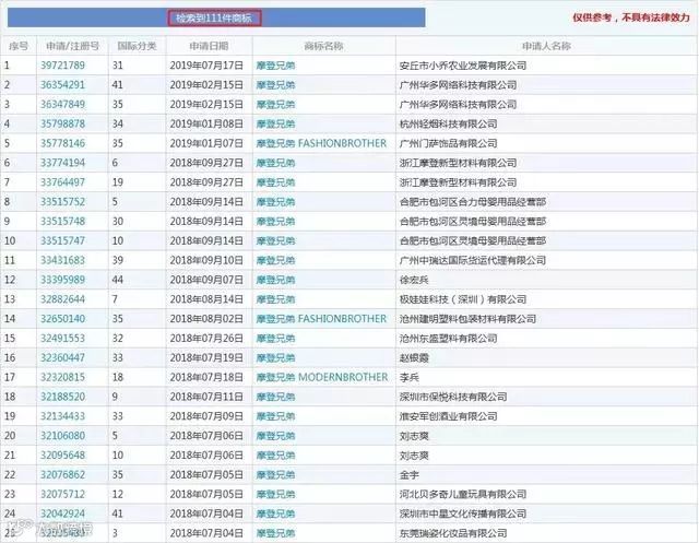 因为“摩登兄弟”的商标已被抢注。现在,根据商标网站查询结果,已经有111个该商标的注册申请。