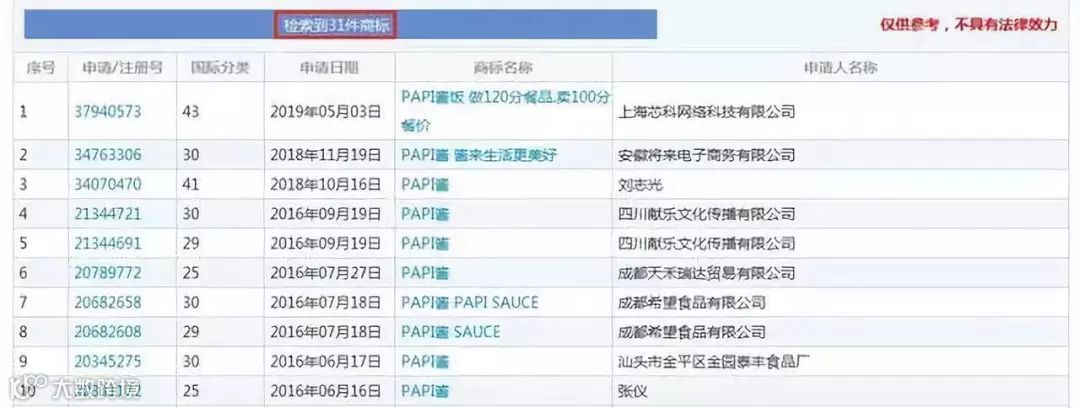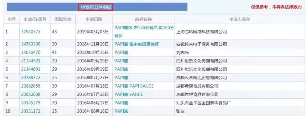 所以,经“papi酱”授权,由泰洋川禾文化传媒徐州有限公司在多个商标类别上申请注册的“papi酱”系列商标,被商标评审委员会驳回,理由是“与其他商标构成近似”。果然,在国家商标局官网查询到,“papi酱”系列商标不止被一家抢注。