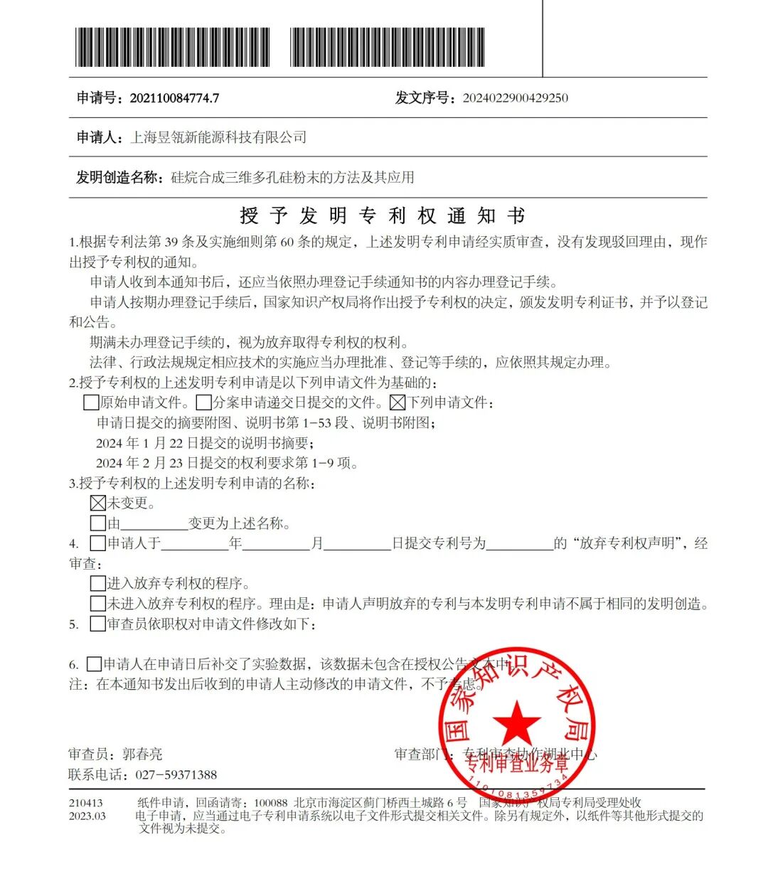 喜讯!昱瓴新能源硅烷沉积硅碳专利获国家发明专利授权,打破美国Group14沉积硅碳称霸局面