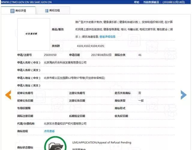 2017年08月02日,北京海纳天合科技发展有限责任公司(简称北京海纳天合科技)申请注册第25659350号“吃货请闭眼”商标,指定使用在除广告片外的影片制作; 健身俱乐部(健身和体能训练); 安排和组织培训班; 在计算机网络上提供在线游戏; 健身指导课程; 培训; 书籍出版; 电视文娱节目; 筹划聚会(娱乐); 娱乐消遣信息等第41类服务上。