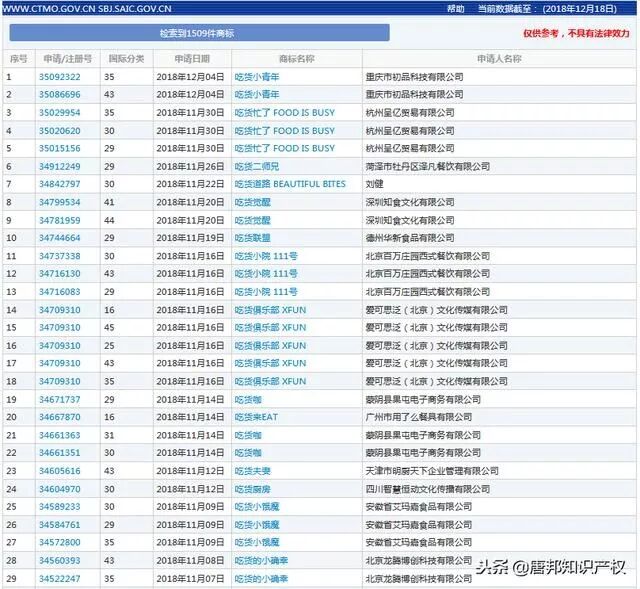 中国商标网信息显示,截止目前,含有“吃货”一词的商标共有1509件,由多家企业或者个人申请注册,包含“吃货”、“吃货天下”、“吃货天堂”、“吃货站着吧”、“吃货靠谱投”、“吃货不得不吃”、“吃货猫”、“吃货阿狸”、“吃货加油站”、“吃货表情”、“吃货部落”、“吃货宇宙 FOODIVERSE”等商标,注册类别也很丰富。