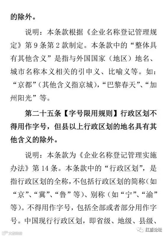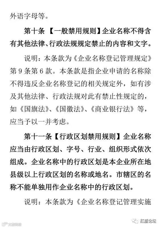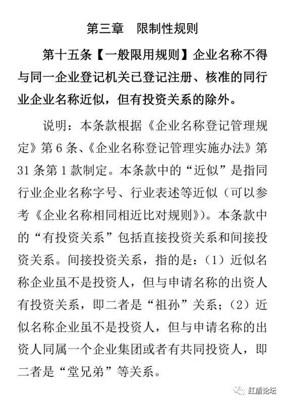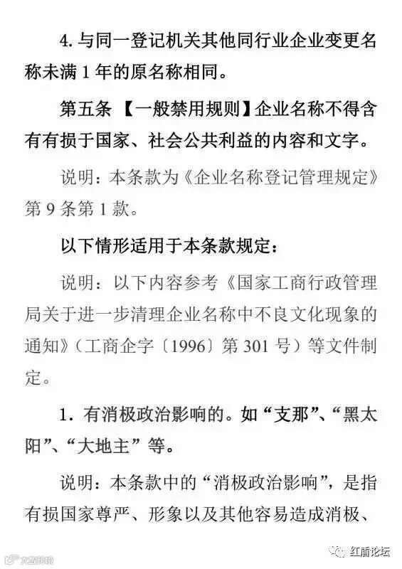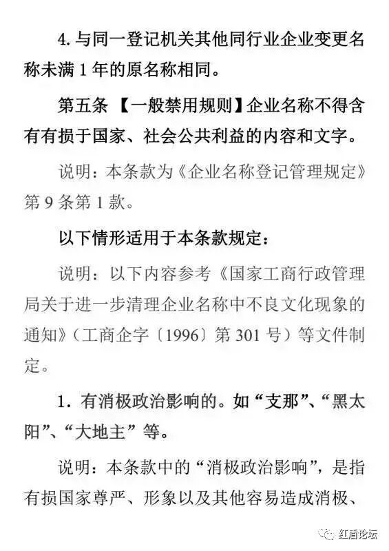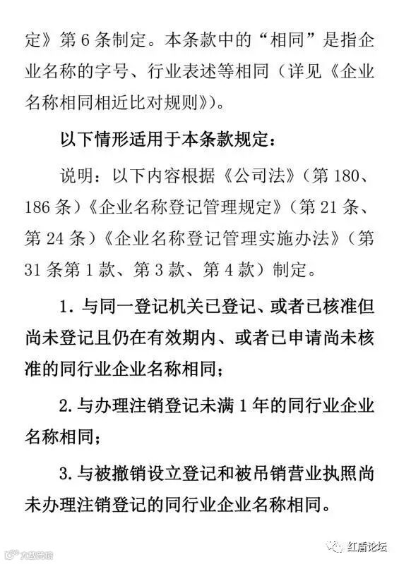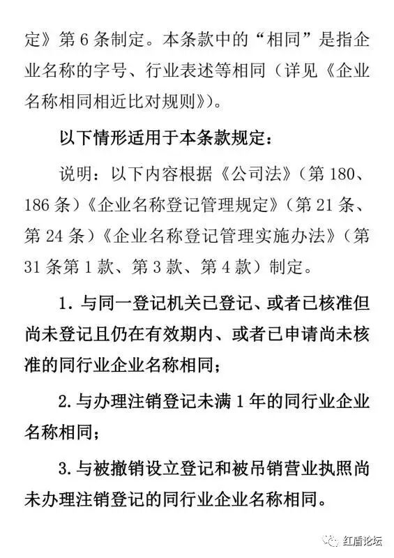 (二)与同一名称核准机关已登记、申请的企业名称行政区划、字号、行业和组织形式排列顺序不同但文字相同。如:北京红光酒业发展有限公司与红光(北京)酒业发展有限公司。
