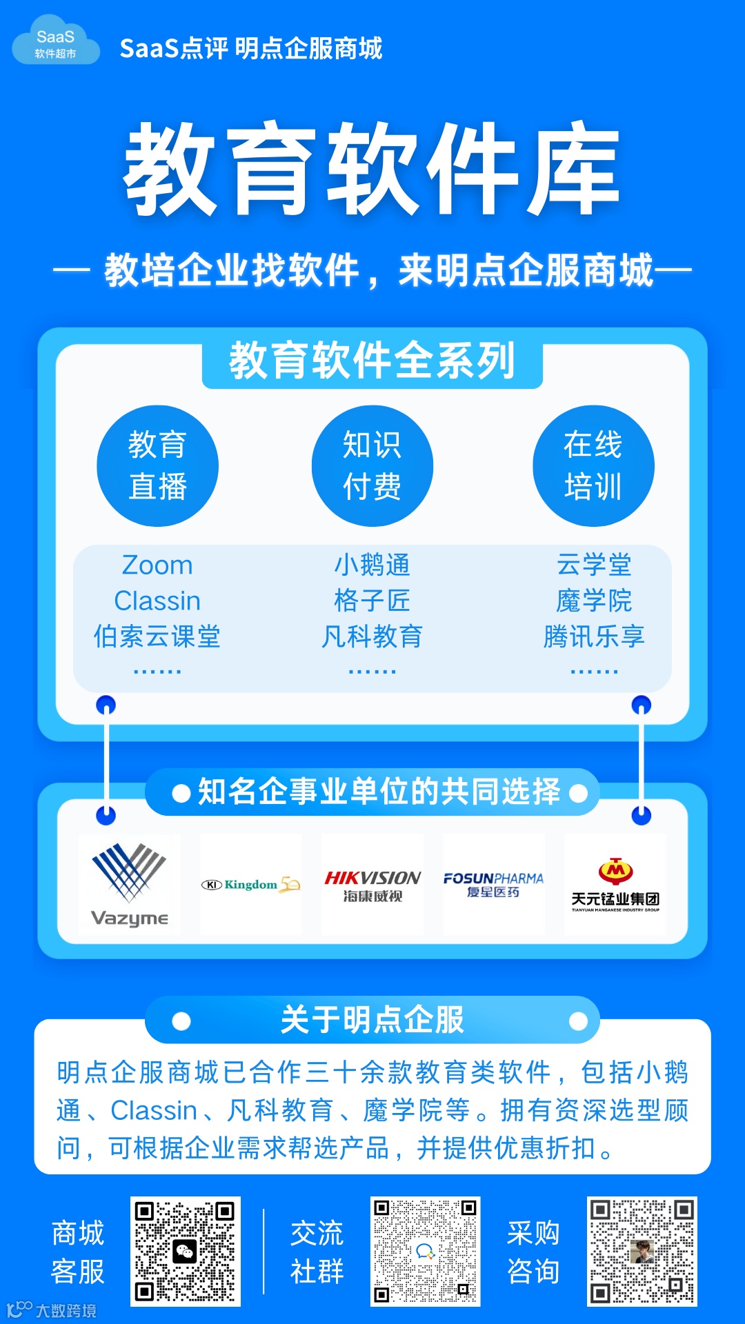如果需要购买教育培训直播系统可以通过我们购买,明点企服商城为企业提供各类SaaS软件产品,目前已合作300余款国内外优质产品,比如有Classin、简用云课堂、Zoom、钉钉会议、腾讯会议、百佳会等多款教育培训直播系统,我们会有专业选型顾问帮您介绍推荐匹配的产品/版本,还有专属优惠福利可以领取。扫码添加顾问,拉你进群领取详细对比资料/免费试用。