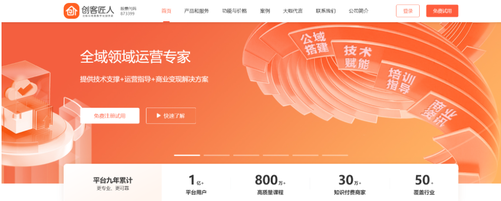 创客匠人是泛知识场景数字化服务商,成立于2019年,公司已覆盖不同领域的泛知识场景,提供从技术支撑、运营指导到商业模式设计的全链路数字化解决方案。通过搭建私域平台,设计知识付费、品牌传播、企业培训、用户运营、直播互动等全场景商业模式,实现知识价值的输出。