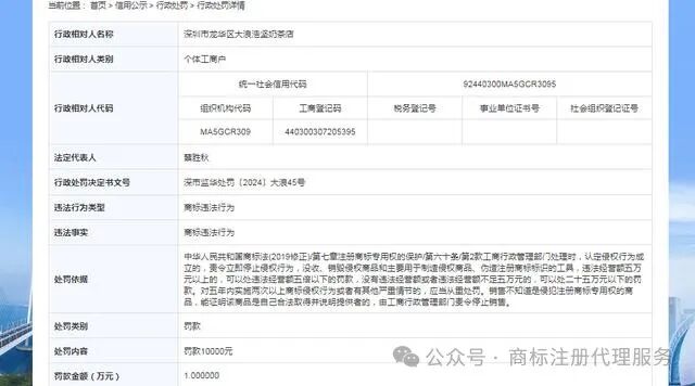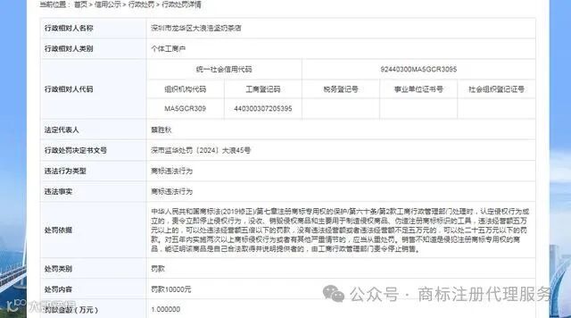 金融界消息,近日,深圳市龙华区大浪浩坚奶茶店因商标违法行为,被深圳市市场监督管理局罚款10000元。