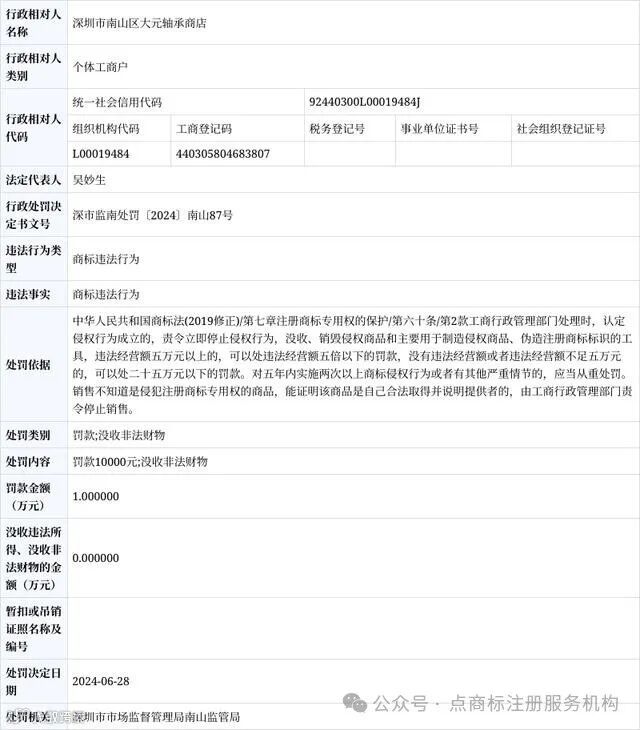 金融界消息,近日,深圳市南山区大元轴承商店因商标违法行为,被深圳市市场监督管理局南山监管局罚款10000元并没收非法财物。