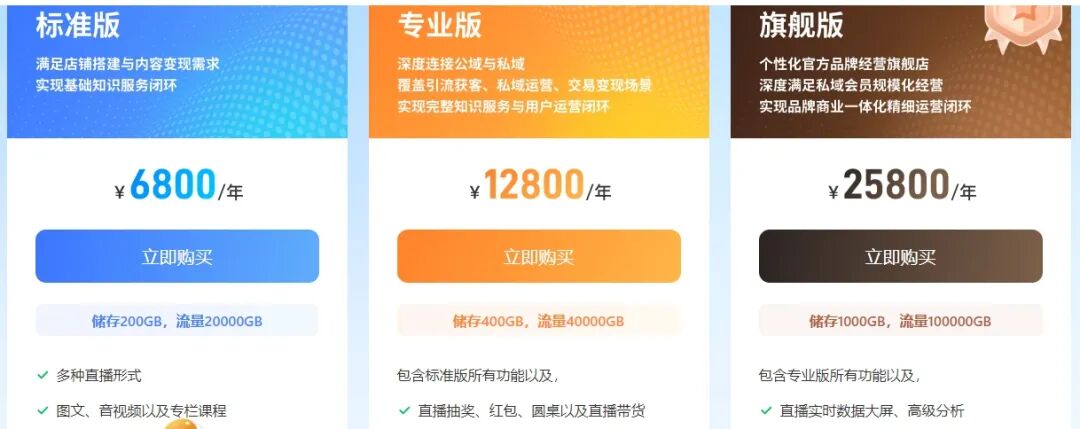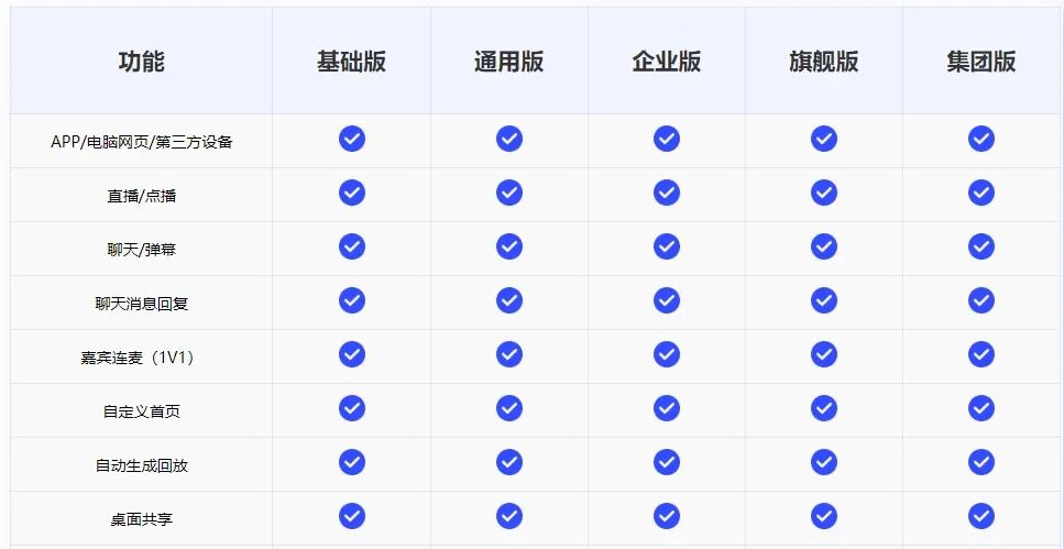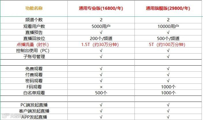 有因直播是根据版本来收费的,目前有基础版、通用版、企业版、旗舰版、集团版五个版本,用户可按需选择版本。