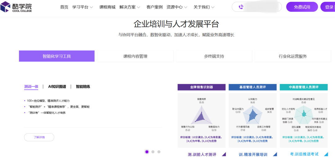(1)测训一体100+岗位模型,精准测评人才能力。支持自定义测评模型,发起测评任务 测评结果以雷达图多维度展示评分。按岗位测评结果,智能匹配推荐课程。支持自定义课程,一键发布培训方案,员工可根据推荐课程,针对性学习。训后自动生成考试题,检测培训效果。考试评分实时同步,可视化呈现人性化图标多维度展现学习结果。