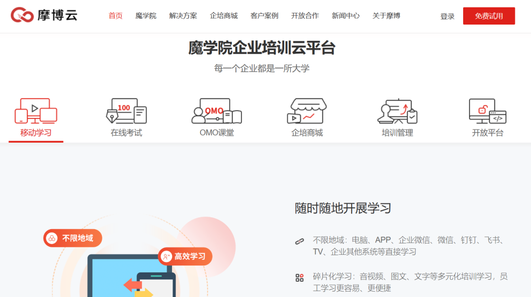 魔学院是一家企业培训SaaS平台,主要通过SaaS和移动互联网技术,为企业员工提供在线学习、在线考试、培训管理的SaaS系统和培训课程商城服务。