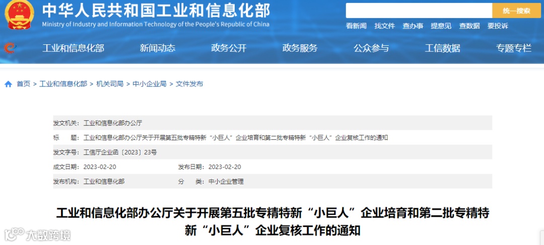 2023年2月20日,工信部通知:将开展第五批专精特新“小巨人”企业培育和第二批专精特新“小巨人”企业复核工作,明确了本批次申报时间,企业2023年3月15日至4月10日期间通过优质中小企业梯度培育平台上传申报材料,而省级中小企业主管部门于2023年5月10日前提交纸质材料。