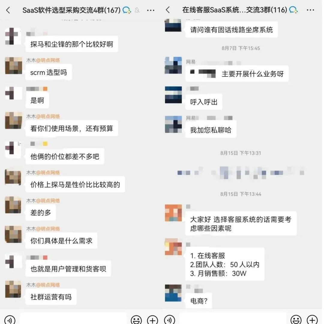 SaaS点评网旗下已建立数十个软件选型采购群,覆盖CRM、SCRM、OA、HRM、BI、ERP、电商、电子签、知识付费、视频会议、呼叫中心、在线客服、云安全等领域。社群成员以企业信息主管、采购负责人、业务负责人为主,同时每个群都有专业的数字化顾问入驻为群友免费答疑。