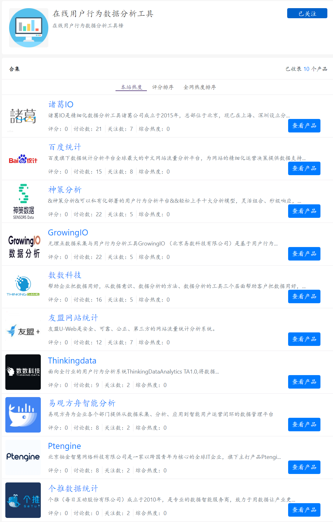 注:以上排序根据产品评分、站内外热度综合计算得出,会不断发生变化,截取日期为2023年9月7日。排名靠前的有诸葛IO、百度统计、神策分析、GrowingIO、数数科技等。