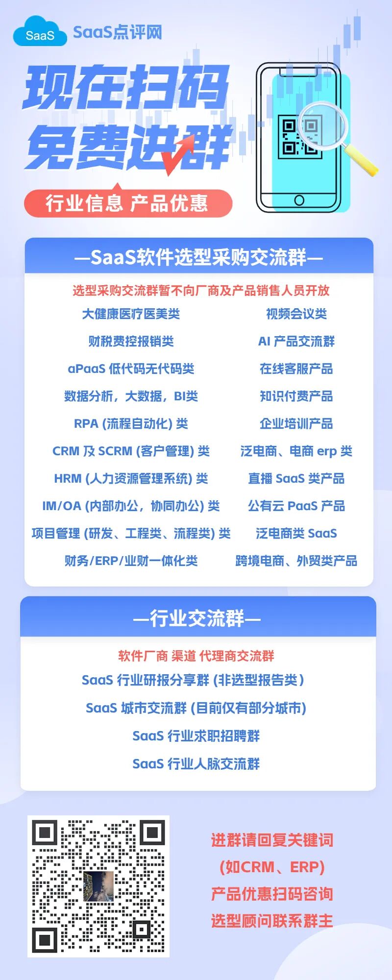 SaaS点评网旗下已建立数十个软件选型采购群,覆盖CRM、SCRM、OA、HRM、BI、ERP、电商、电子签、知识付费、视频会议、呼叫中心、在线客服、云安全等领域。社群成员以企业信息主管、采购负责人、业务负责人为主,同时每个群都有专业的数字化顾问入驻为群友免费答疑。