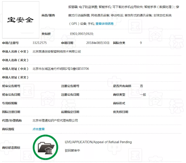 北京国通创安报警网络技术有限公司于2018年8月30日申请注册,指定使用在第9类“报警器;电子防盗装置”等商品上。