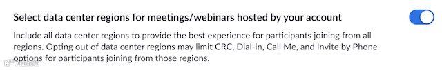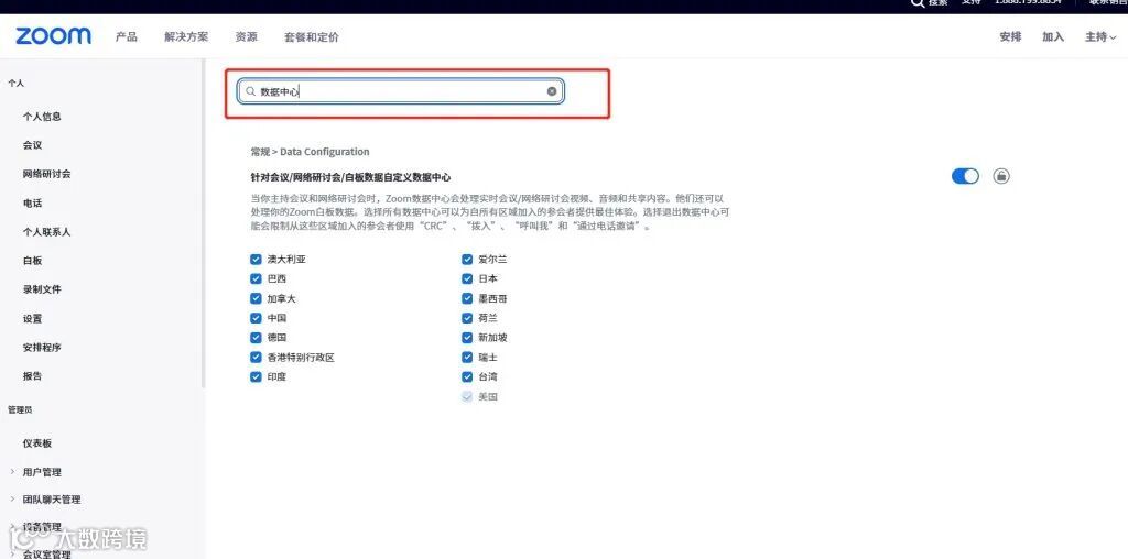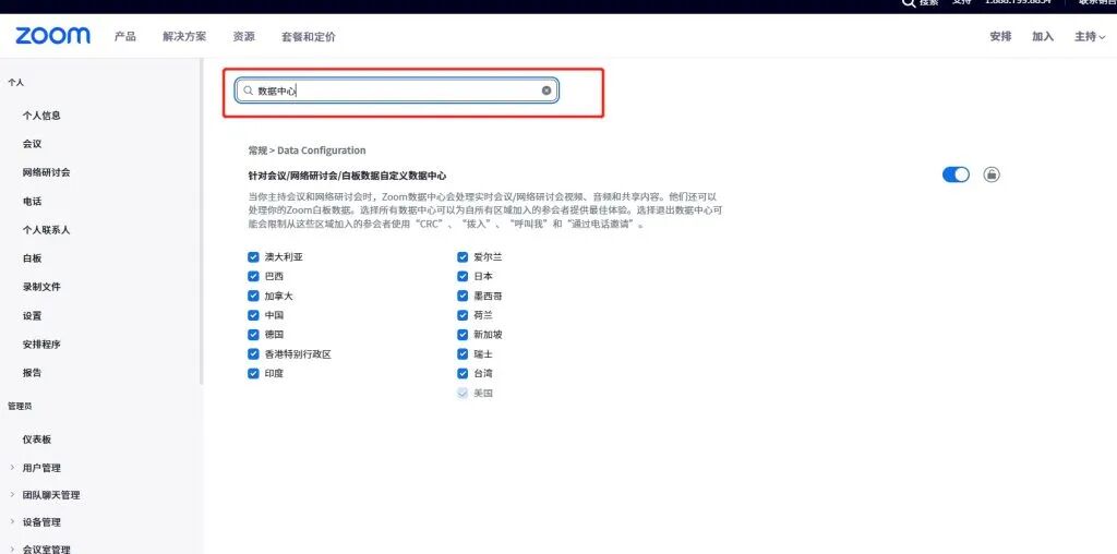在会议中(高级)下,确认已启用为您的账户主持的会议和网络研讨会选择数据中心区域。