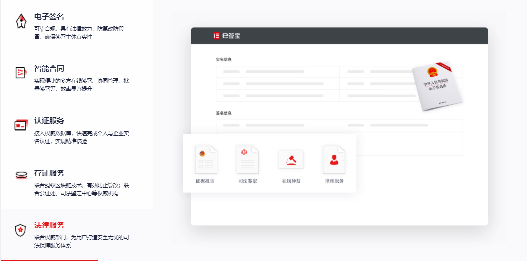 答:e签宝,深耕电子签章全生命周期服务二十余年,为党政机构、企业、以及个人提供安全可信的电子签名、智能履约、物电一体化印章管理、身份认证、区块链证据保全、在线速裁与司法服务。为用户提供业内领先的软件应用与技术服务支持。
