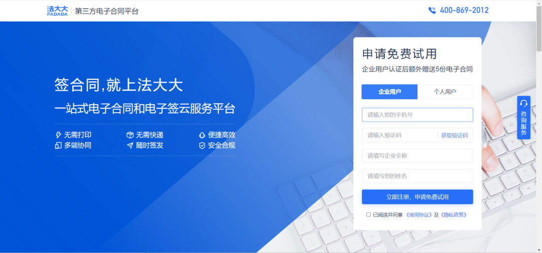 法大大是国内领先的电子合同与电子签云服务平台(Fadada Agreement & Signature Cloud),致力为企业、政府和个人提供基于合法数字签名技术的电子合同和电子单据的在线协同签署及管理服务,构建商业契约的数字化基础能力,助力企业数字化转型和社会数字化升级。