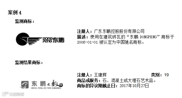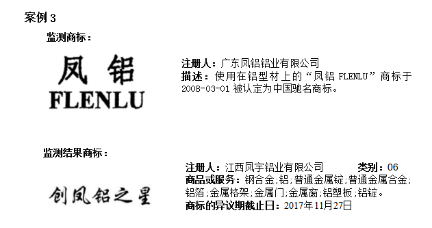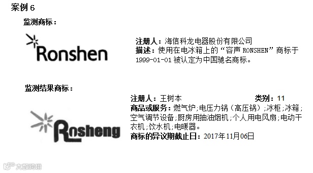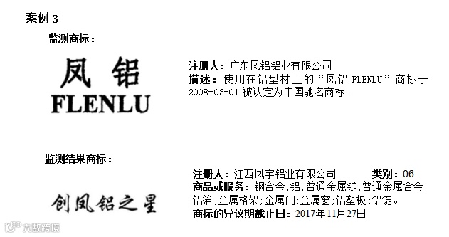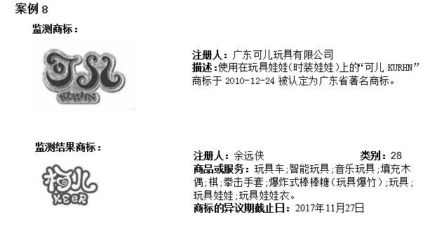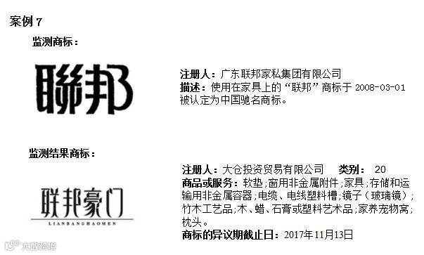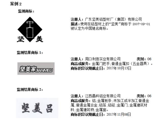 到目前为止,本市共拥有由行政认定的中国驰名商标共158件,广东省著名商标共452件,本局运用佛山地区商标统计分析与预警保护软件系统对初审公告期的商标是否存在可能与本市的驰名著名商标构成在类似商品上的抢注行为进行监测。近期部分抢注监测结果案例公布如下: