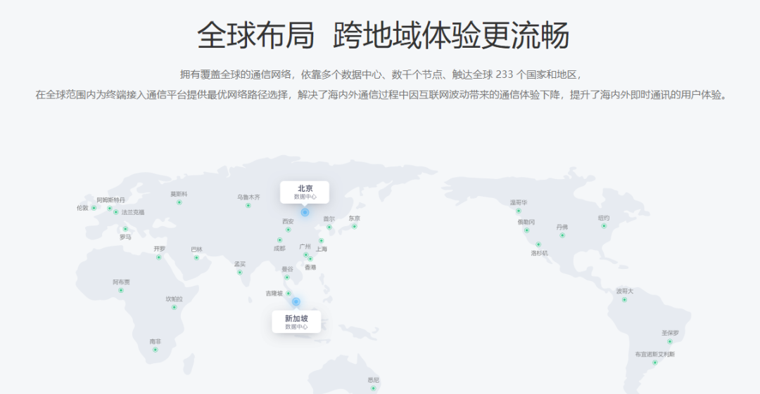拥有覆盖全球的通信网络,依靠多个数据中心、数千个节点、触达全球233个国家和地区,在全球范围内为终端接入通信平台提供最优网络路径选择,解决了海内外通信过程中因互联网波动带来的通信体验下降,提升了海内外即时通讯的用户体验