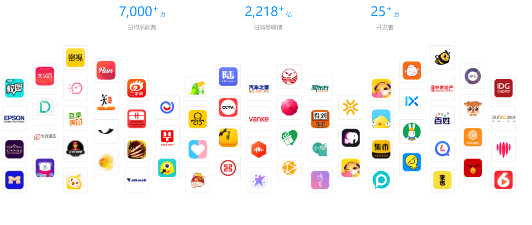 融云基于海量业务的技术锤炼,从基础架构到精细化运营,充分体现平台实力;凭借卓越的产品和优质的服务,在开发者规模、行业覆盖率、平台日活跃用户数、日均消息量等方面超越全行业。目前,已有数十万互联网用户及上千家企业级用户通过融云实现了场景化沟通,并从中获益,包括招商银行、工商银行、交通银行、民生银行、中国移动、四川航空、CCTV微视、中联重科、58赶集、大河报业、新东方、陆金所、易车网、猪八戒、蔚来汽车、得到APP、荔枝FM、汽车之家、优酷来疯、携程爱玩、聚力视频、百姓网等知名企业及应用。