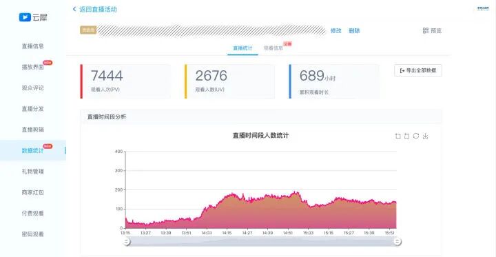 还有就是有完善的数据统计PV、UV每一项数据都很全面,还有就是直播时间段统计图对我们的帮助非常大,直播结束后,分析观众对哪些内容感兴趣就靠它了!