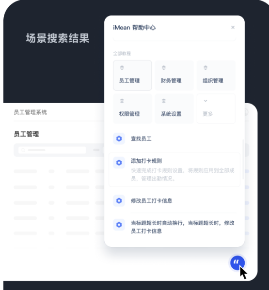 大多数正在使用您软件的用户在遇到困难的时候,并不能轻易的在传统帮助中心中浏览或者文字搜索的方式找到答案。iMean的用户只要轻点iMean按钮,就会根据您用户当前的场景信息进行搜索,猜测用户可能遇到的问题,从帮助中心中搜索出和当下场景最相关的几个教程。相比传统的帮助中心,免去了用户从大量文档中查找具体教程时容易找不到,选择困难的问题。