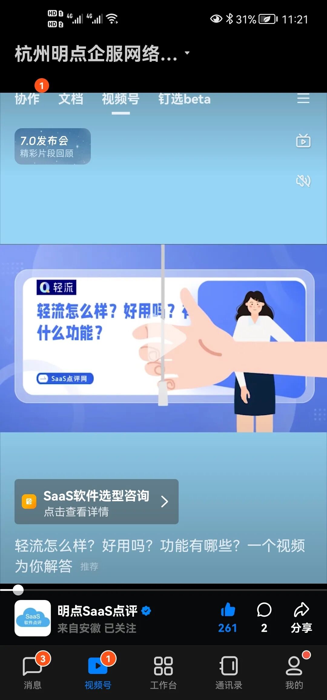 3,钉钉视频号目前进入门槛低、竞争低。我们测试了一个月,SaaS点评网账号下的视频整体播放100W+,有多条播放量10W+。