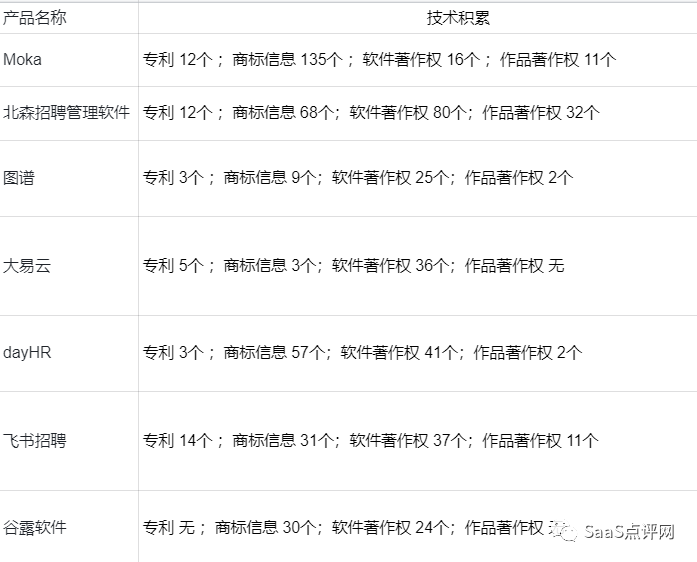 几家公司的基础服务能力都具备,(如代理商、专业客服、帮助中心、商家交流等),知识产权方面较突出的是北森,其次是飞书、Moka,图谱、谷露一般,但综合来看几家公司的技术储备实力仍有差别。