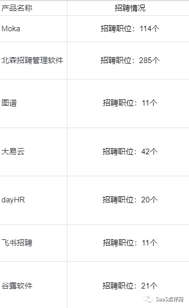 明显看出Moka、北森招聘岗位很多,说明公司还在扩张中;大易云较多,说明公司正在稳固发展。而图谱、dayHR、飞书招聘、谷露招聘人数较少,团队规模扩展放缓。