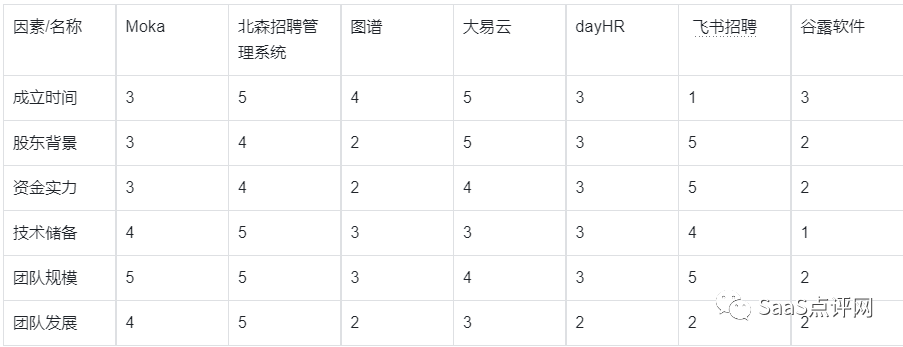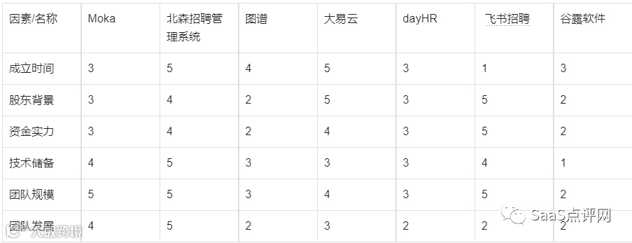 首先,北森、图谱、大易云成立时间更早,相应行业经验和产品开发经验比较丰富,有利于提供更好的服务;第二 ,Moka、北森、dayHR、飞书的资金实力更强,可持续发展的能力较强;第三,Moka、北森、大易云、飞书的技术和团队发展具有更大潜力。