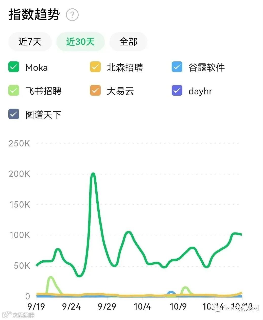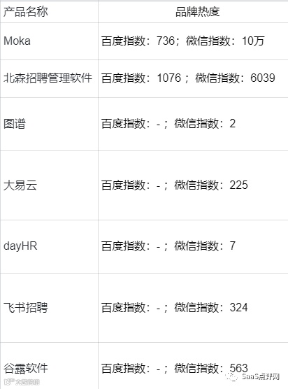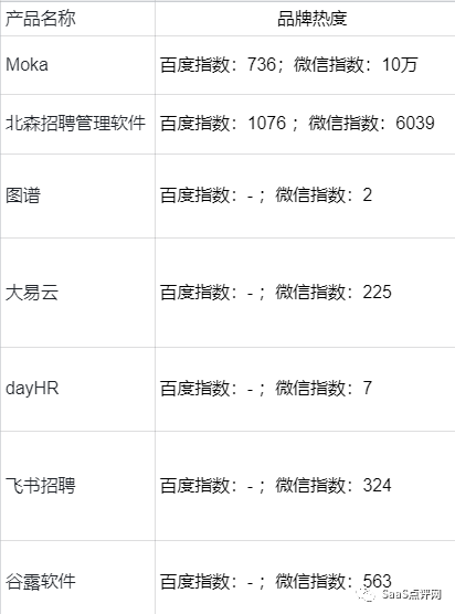 根据两大平台的搜索指数来看,Moka、北森的热度都比较高,客户和用户也相对更多,头部客户的知名度也相对较高。大易云、飞书招聘分别背靠用友和字节,因而有一定影响力。综上,Moka、北森的品牌知名度较高。