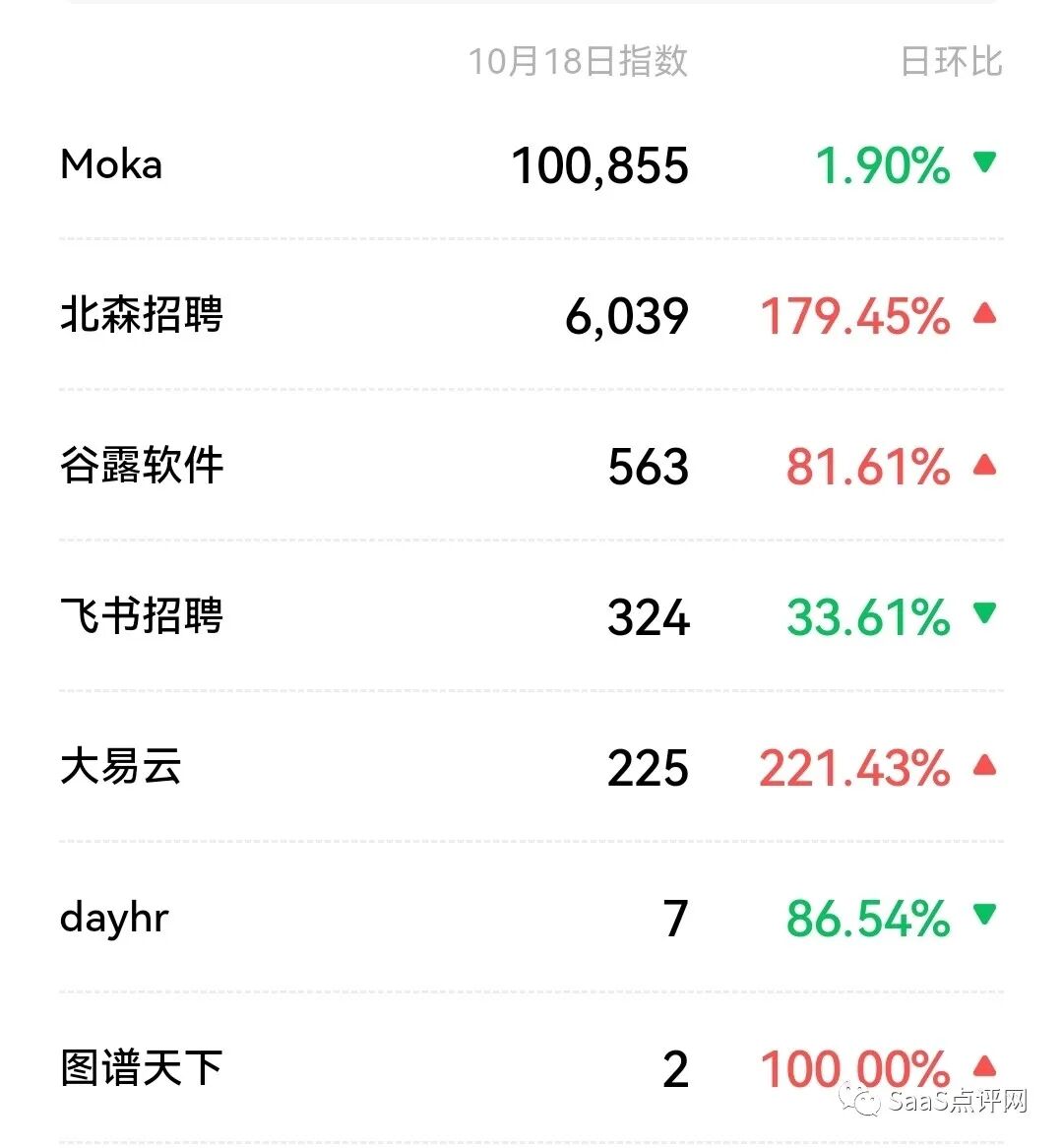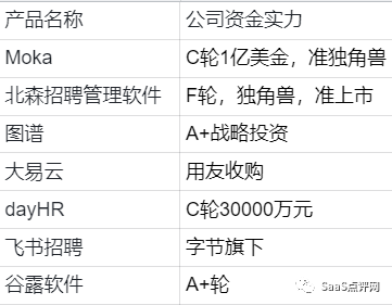 北森、大易云、飞书招聘因为融资金额较高,轮次较大、背后资本集团强劲,所以公司实力相对突出;Moka、dayHR较强;图谱、谷露一般。