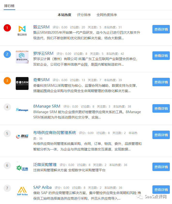 SaaS点评网(www.saasruanjian.com)于2019年上线,是一个SaaS软件选型交流平台,致力于帮助企业找到合适的产品。本篇为大家介绍最新SRM排行榜单,还附有选型资料哦~
