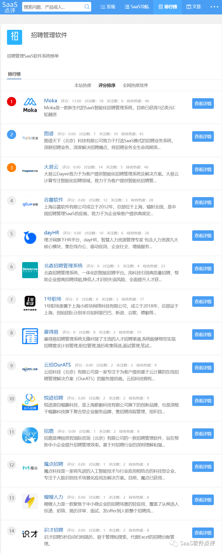 SaaS点评网自2019年上线以来不断收录用户评价,旨在帮助大家做出更好的选择。目前国内此类产品较多,本站收录了14个,例如图谱、谷露软件、云招OurATS、悦迹招聘等。本文介绍招聘管理软件排行榜单。