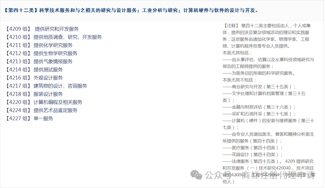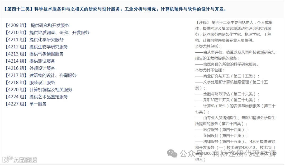 第四十二类主要包括由人提供的涉及复杂活动领域的理论和实践服务,如科学实验室服务,工程学,计算机编程,建筑学服务或室内设计。