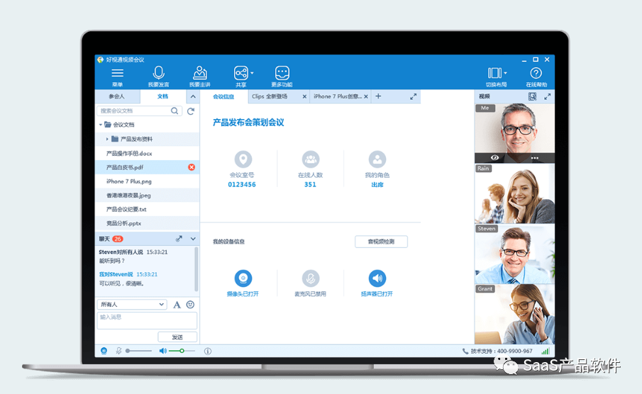 全时云会议产品很不错,给力。全时云会议提供电话与VoIP融合,6路视频共享,桌面、文档、白板共享,在线聊天,会场锁定,举手,点名, Outlook、微信、QQ、通讯录邀请开会方式,会中外呼参会人等功能。