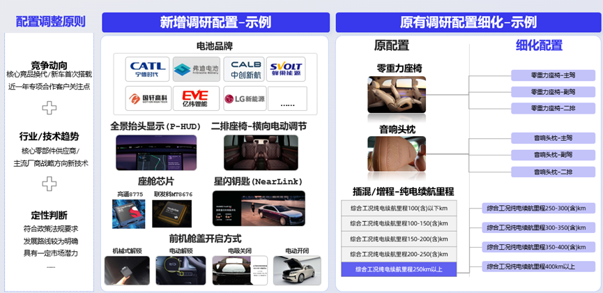 进一步细化(28项):细化升级趋势明显的续航里程、激光雷达个数、电压平台、前备箱容积、零重力座椅、头枕音响等配置;